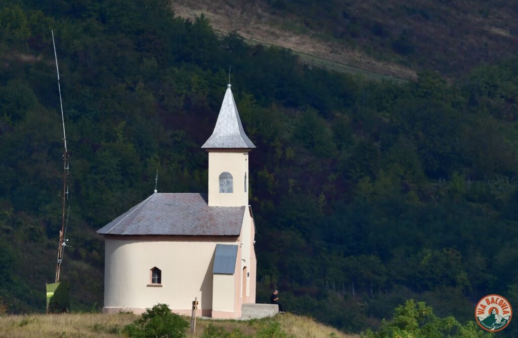 Voluntar la Via Bacovia Trail în așteptarea alergătorilor la Capela Calvar,Logo Via Bacovia creat de Ronin Graphic Designs fotograf voluntar la Capela Ghert!